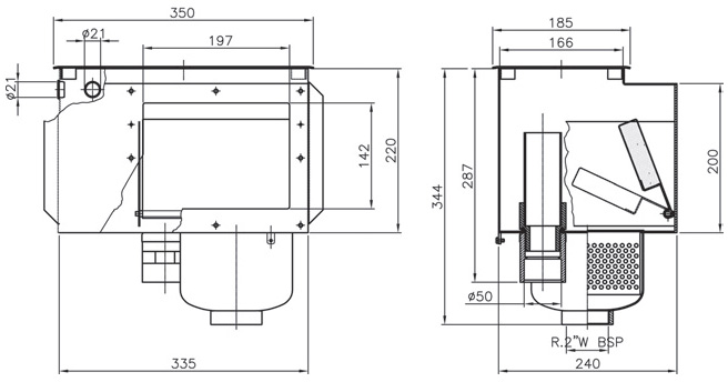 Skimmer aus Edelstahl in V4A-Qualität für den Einbau in Betonbecken mit einer Einbautiefe von 240 mm, Saugbreite ca. 200 mm inkl. Schmutzsieb und Überlauf mit 50 mm Klebemuffe sowie senkrechtem Abgang 2" IG. Zum Einbau eines Wasserstandsreglers ist bereits ein Kammer im Skimmer vorgesehen.