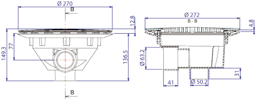 • unterer Ausgang, Klebemuffe d= 50 mm für die Verankerung des Bodenablaufs beim Gießen der Fundamentplatte