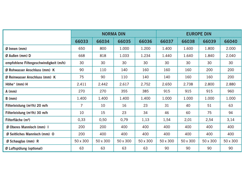Qualität überzeugen durch hochwertigste Materialien, modernste Fertigungsverfahren und eine optimal verbesserte Konstruktion nach DIN 19605*/19643*. Die Behälter werden unter Berücksichtigung der europäischen Norm für Druckkessel 97/23/CE aus glasfaserverstärktem Polyester gefertigt. Jeder Filterbehälter wird vor Auslieferung einer umfangreichen Druck und Qualitätsprüfung unterzogen. Bei allen Modellen wurde der Reinwasserausgang unter dem Düsenboden angeordnet, so dass das Filterbett nicht durch die Reinwasserverrohrung unterbrochen wird.