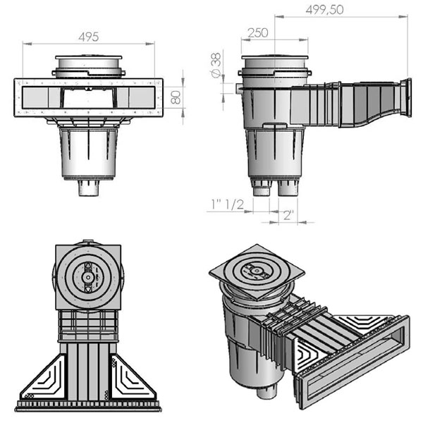 Komplett mit Flanschsatz, Dichtungen, Schrauben, (mit Gewindeinserts). Seitlicher Abgang 2“, der von innen zur Druckprüfung verschlossen werden kann. Abgang nach unten 1½“ zur Verbindung mit hydrostatischem Ventil und Drainagerohr. Saugleistung 0,5 m/s. Maximal empfohlene Durchflussmenge: 13 m³/h. Zur kompletten Entwässerung muss der Bodenablauf bündig mit dem Beckenboden installieren werden.