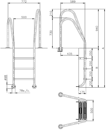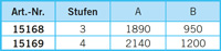 Erste Stufe als Sicherheitsstufe (doppelte Breite). Holmdurchmesser 43 mm. Stufenbreite 80 mm. Leiterholme unterschiedlich hoch. Holmausladung 589 mm, Holmhöhe 730 mm und 940 mm.