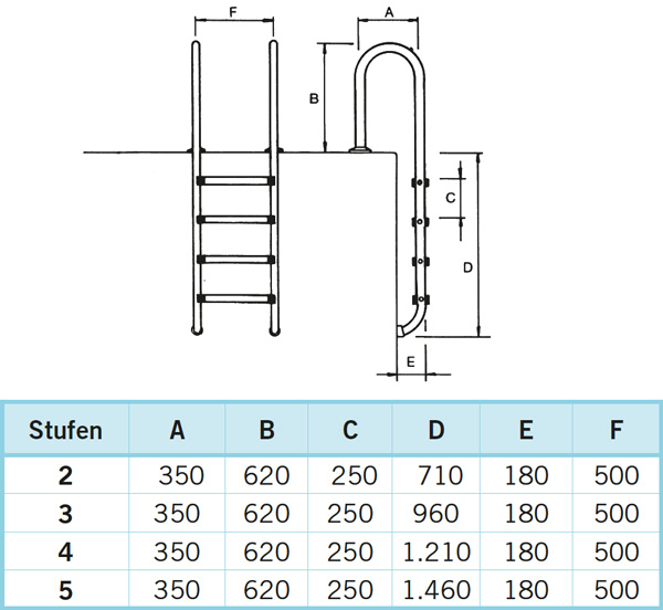 Neben der hier vorgestellten 3-stufigen Variante für bis zu 1,20 m Tiefe sind auch Ausführungen für 1,50 m (4 Stufen) und 1,80 m (5 Stufen) erhältlich.