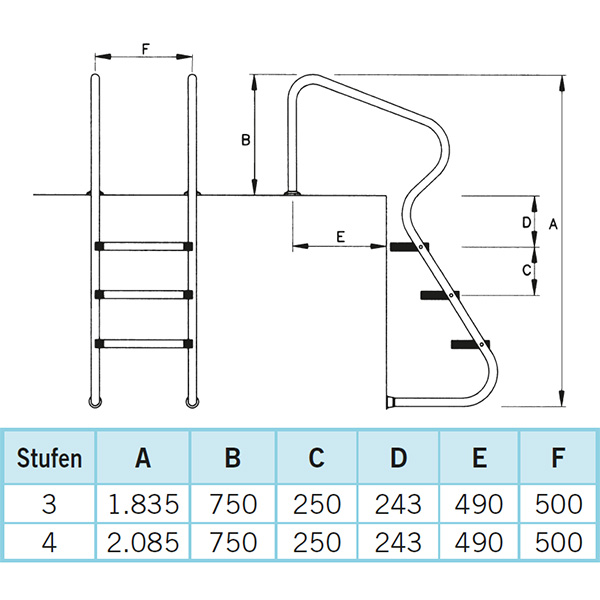 Schwimmbad - Einbautreppe Deluxe kurz, aus V4A mit Einbauhülsen, hochglanzpoliert, mit rutschfesten Sicherheitsstufen, Holmdurchmesser 43 mm