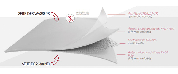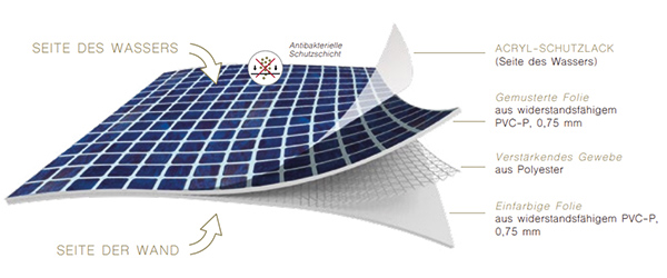 Die gewebeverstärkten Folien Sensation sind durch einen besonderen Schutzlack gegen Flecken geschützt. Der Schutzlack sorgt dafür, dass die im Wasser vorhandenen Algen und Bakterien nicht in das PVC eindringen können.