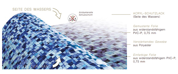 Der Schutzlack auf der Seite der Beckenwand schützt die Folie gegen Mikro-Organismen, die sich bisweilen zwischen Wand und Folie bilden können. Durch den beidseitigen Schutzlack ist die Folie von beiden Seiten her geschützt. Damit bleibt sie über Jahre hinaus wunderschön, und Sie selbst müssen sich keinerlei Sorgen machen.