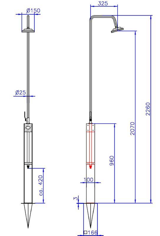 Per Erddorn wird die Dusche im Rasen verankert, diese kann danach sofort an den Gartenschlauch angeschlossen werden.