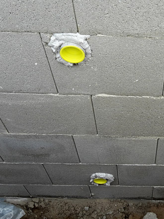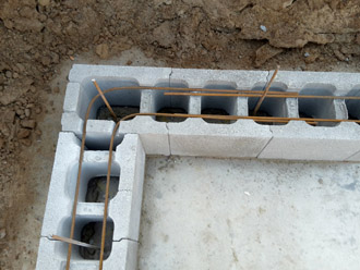Zuerst wird mit einer Schnur das äußere Abmaß absteckt. Hierbei ist genaues Arbeiten notwendig, da es die Grundlage für alle Folgearbeiten ist. Beim Setzen der ersten Reihe ist darauf zu achten, dass die Steine in Waage gesetzt werden. Ungenauigkeiten beim Setzen der ersten Reihe wirken sich in den oberen Reihen noch gravierender aus. Sollte die Anschlussbewehrung von der Bodenplatte zur Wand noch nicht vorhanden sein, muss diese nach der ersten Reihe gebohrt werden und die vertikalen Eisen gesetzt werden. Die horizontale Bewehrung kommt in jeder Reihe Steine umlaufend.