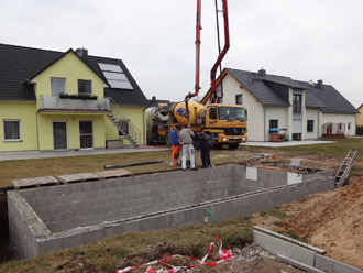 Im Anschluss werden die Wände mit Lieferbeton ausgegossen. Alternativ kann man auch Reihe für Reihe mit der Hand ausfüllen. In beiden Fällen muss der Beton mit einem Betonverdichter verdichtet werden.