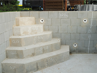 Die Treppe kann je nach Treppenform ebenso mit den Schalbetonsteinen oder mit Schaltafeln hergestellt werden.