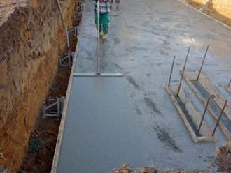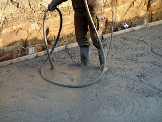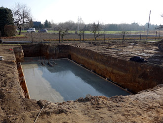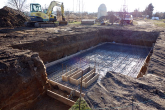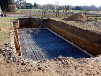Um spätere Setzungsschäden zu vermeiden, muss auch unter dem Fertigbecken eine Bodenplatte gegossen werden. Unter dieser Bodenplatte befindet sich eine Drainageschicht aus verdichtetem Schotter. Je nach Anforderung erfolgt eine min. einlagige Bewehrung der Bodenplatte.