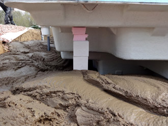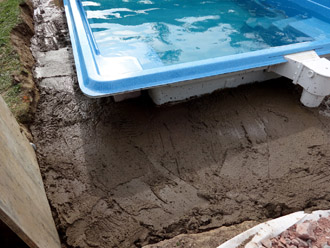 Um den Beckenkörper vor Verformungen zu schützen muss das Becken druckfest hinterfüllt werden. Eine Möglichkeit ist es das Becken mit Magerbeton zu hinterfüllen.