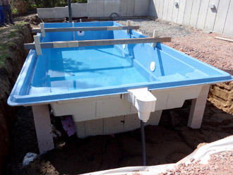 Es empfiehlt sich vor dem Hinterfüllen das Becken an den Längsseiten auszusteifen. Der Wasserstand im Becken wird schrittweise erhöht und dann bis max. zur gleichen Höhe hinterfüllt. Beim Hinterfüllen mit Magerbeton darf nicht verdichtet oder gerüttelt werden und muss umlaufend gleichmäßig gefüllt werden.