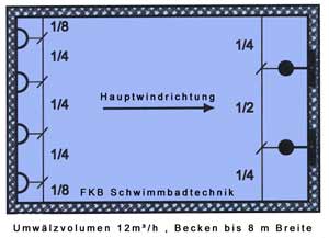 Nachteilig können sich auch eine Dunstglocke über der Wasseroberfläche sowie eine stärkere Wellenbildung beim Schwimmen, bedingt durch die Reflektion von Wellen an der Beckenwand, auswirken. Die Beckendurchströmung erfolgt beim Einsatz des Skimmer-Systems meist horizontal in Beckenlängsrichtung. Dabei werden die Einlaufdüsen in die dem Skimmer gegenüberliegende Beckenwand in einer Wassertiefe von ca. 40 50 cm eingebaut. Bei größeren Wassertiefen können die Einlaufdüsen auch in zwei Reihen untereinander versetzt angeordnet werden. Bei der zweireihigen Anordnung empfiehlt es sich, für die oberen Düsen einen Abstand von 30 cm zur Wasseroberfläche und für die unteren Düsen einen Abstand von 30 cm zum Beckenboden einzuhalten.