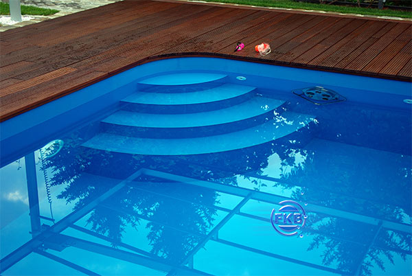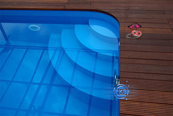 Die Oberfläche ist leicht strukturiert, wodurch sie rutschhemmend wirkt. Bei allen Rechteck- und Freiformbecken sind die Seitenwände außen mit Stahlprofilen verstärkt.