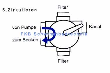 Durch die Funktion "Zirkulieren" wird das Wasser von der Pumpe direkt in das Schwimmbecken geführt, ohne durch das Innere des Filters geleitet zu werden. Diese Funktion ist zur Beseitigung eventueller Defekte am Filterbehälter oder zur schnellen Aufheizung des Schwimmbadwassers vorgesehen. 1. Pumpe abschalten