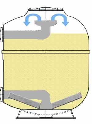 Das Prinzip der Flächenfiltration findet bei Sandfiltern statt. Hierbei werden die Verunreinigungen des Schwimmbadwassers in den ersten Zentimetern der Sandfüllung aufgenommen. Da mit zunehmender Belastung der Filterschicht der Druckverlust im Filter ansteigt, muss regelmäßig rückgespült werden. Beim Rückspülen wird wird der Wasserstrom im Filterbehälter über das 6 Wegeventil umgekehrt und drucklos in den Abfluss / Kanalisation geleitet.