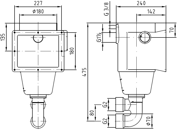 NiSn-beschichtet. Einbautiefe 240 mm, mit Skimmerklappe, Verlängerung als Höhenausgleich für Deckel und Siebkorb aus Kunststoff und einem regelbaren 2-Wege-Steuerventil zum Anschluß eines Bodenablaufes.