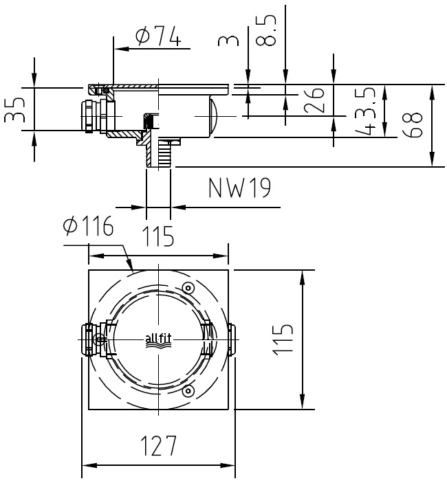 NW 19, M25x1,5 mit Deckel aus V4A, poliert.