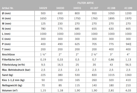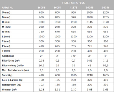 Die Wasserzirkulation erfolgt durch den mittleren Wasserverteiler auch direkt nach unten, wodurch die Zirkulation während des Filter- und Rückspülvorgangs verbessert wird. Optimierte Restwasserentleerung 1" bei Ø 500 - 950 mm und 2 ½" bei Ø 1.050 mm und 1.200 mm über Kugelhahn (im Lieferumfang) mit Gardena-Anschluss. Schütthöhe 1.000 mm, optional mit 1.200 mm Schütthöhe als Artic Plus lieferbar. Artic Filter