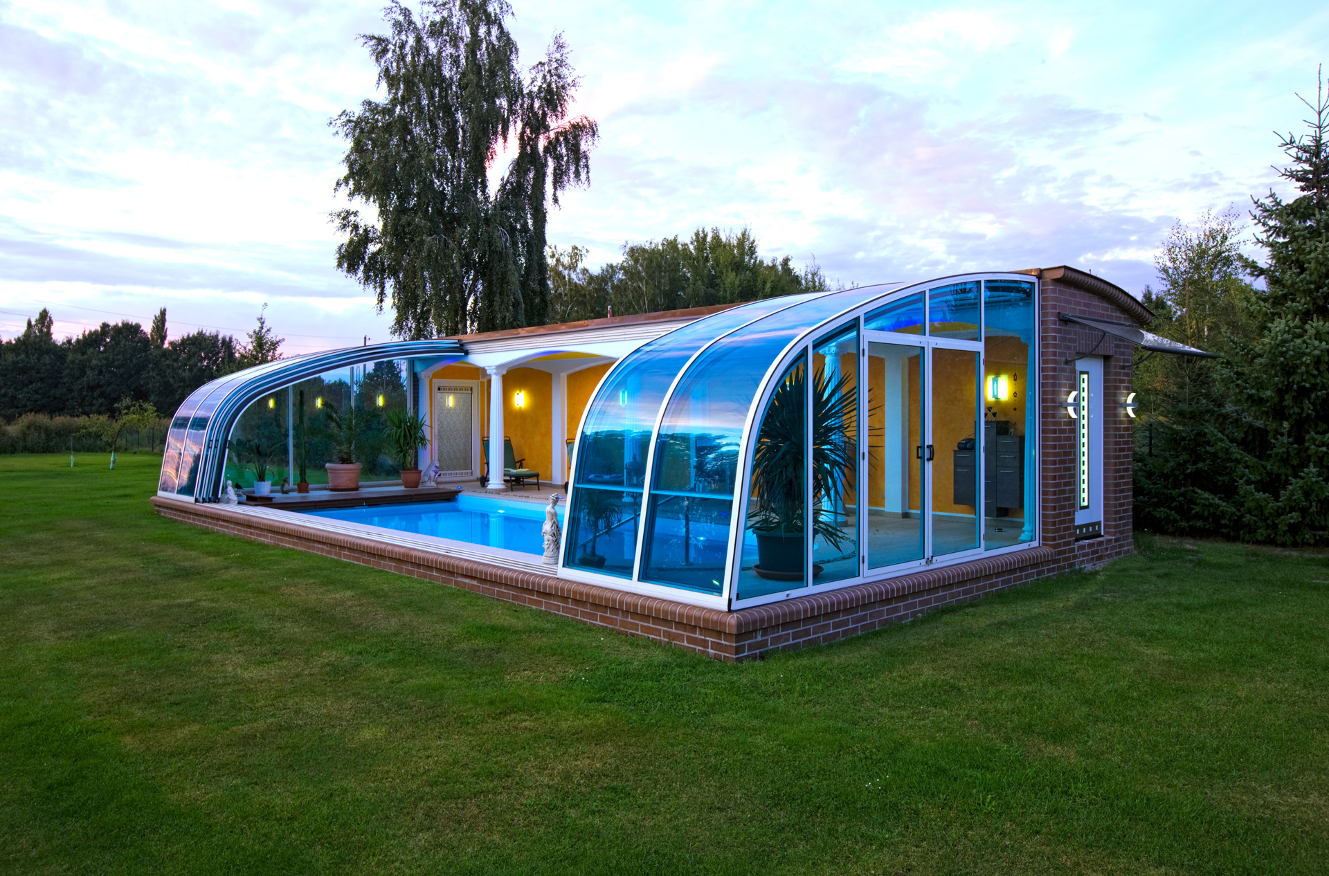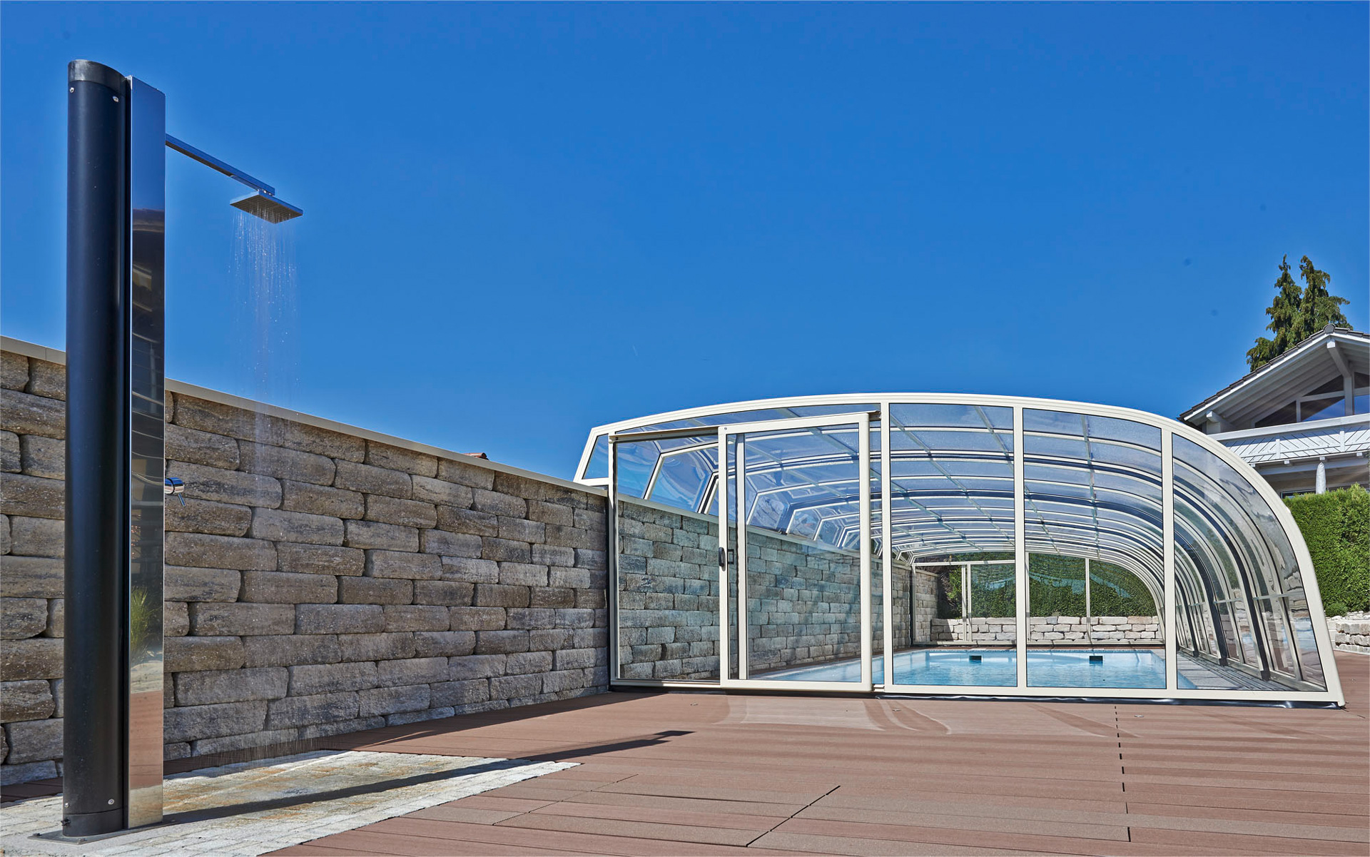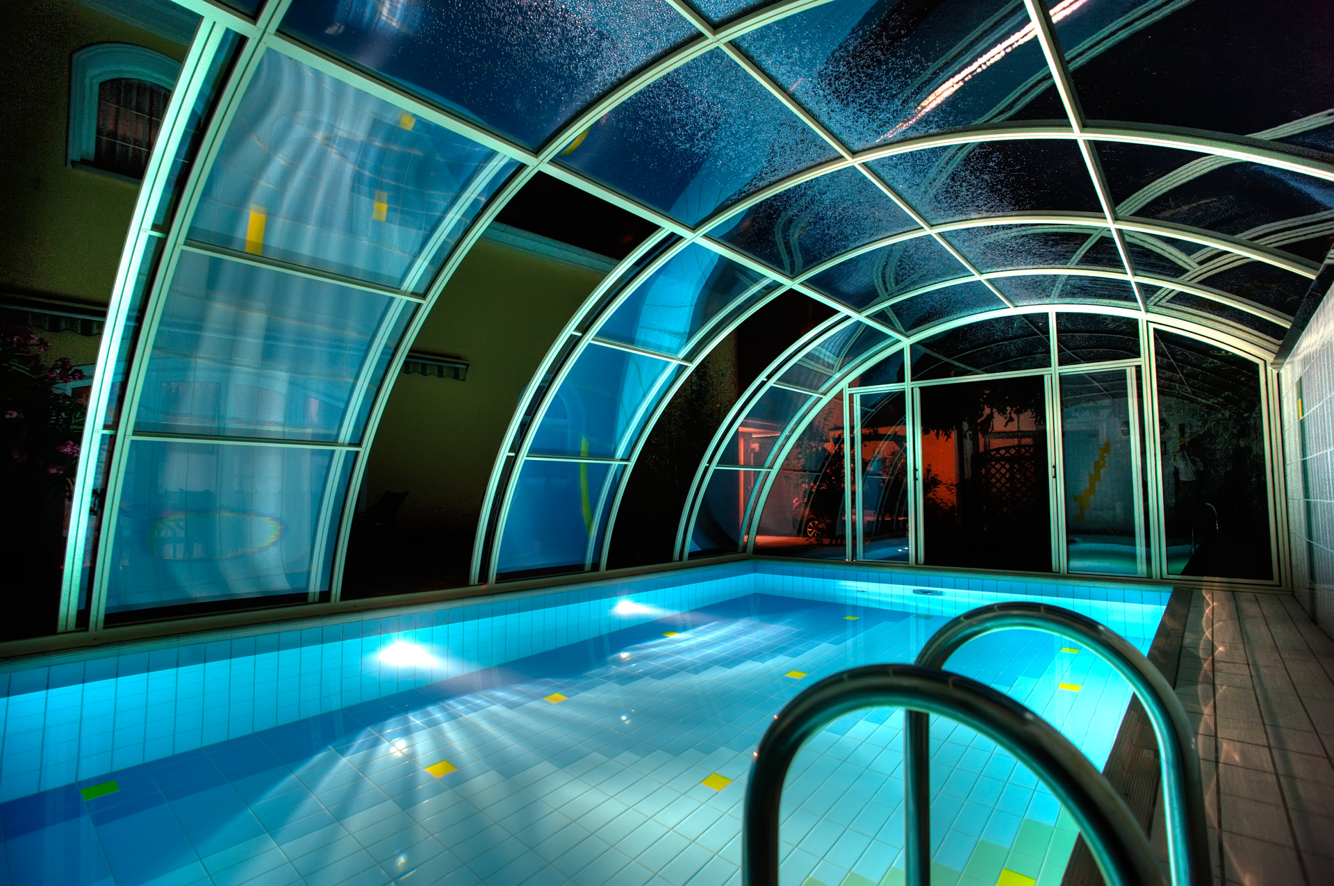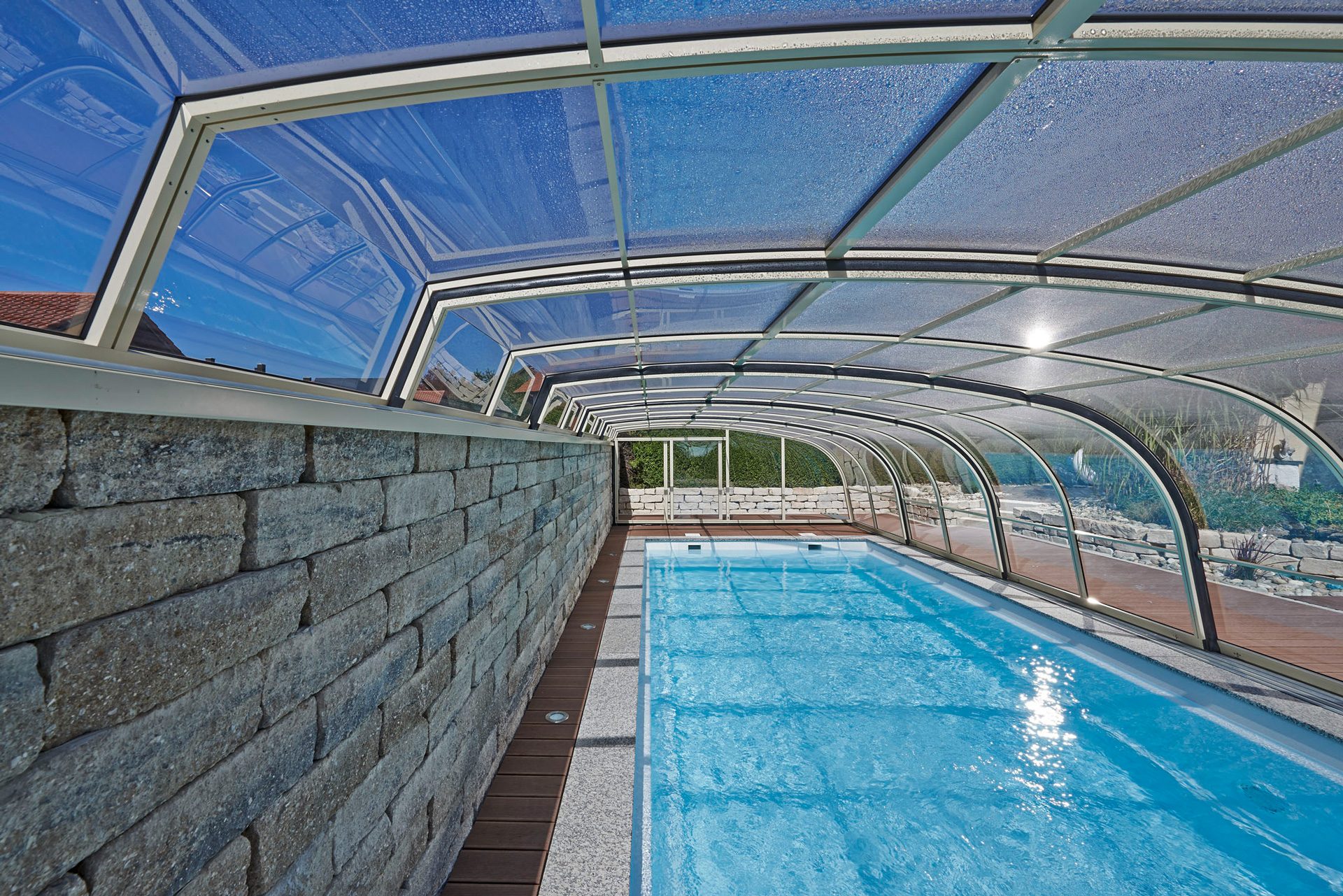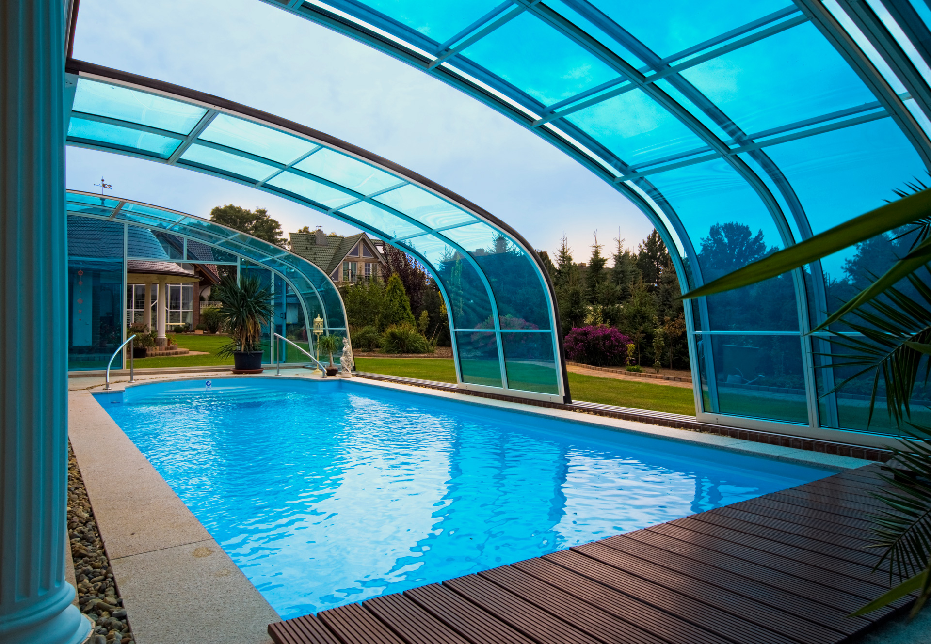 Die Poolüberdachung verlängert Ihre Badesaison um mehrere Monate und ermöglicht Badevergnügen in einer wohltemperierten Umgebung auch bei schlechtem Wetter.