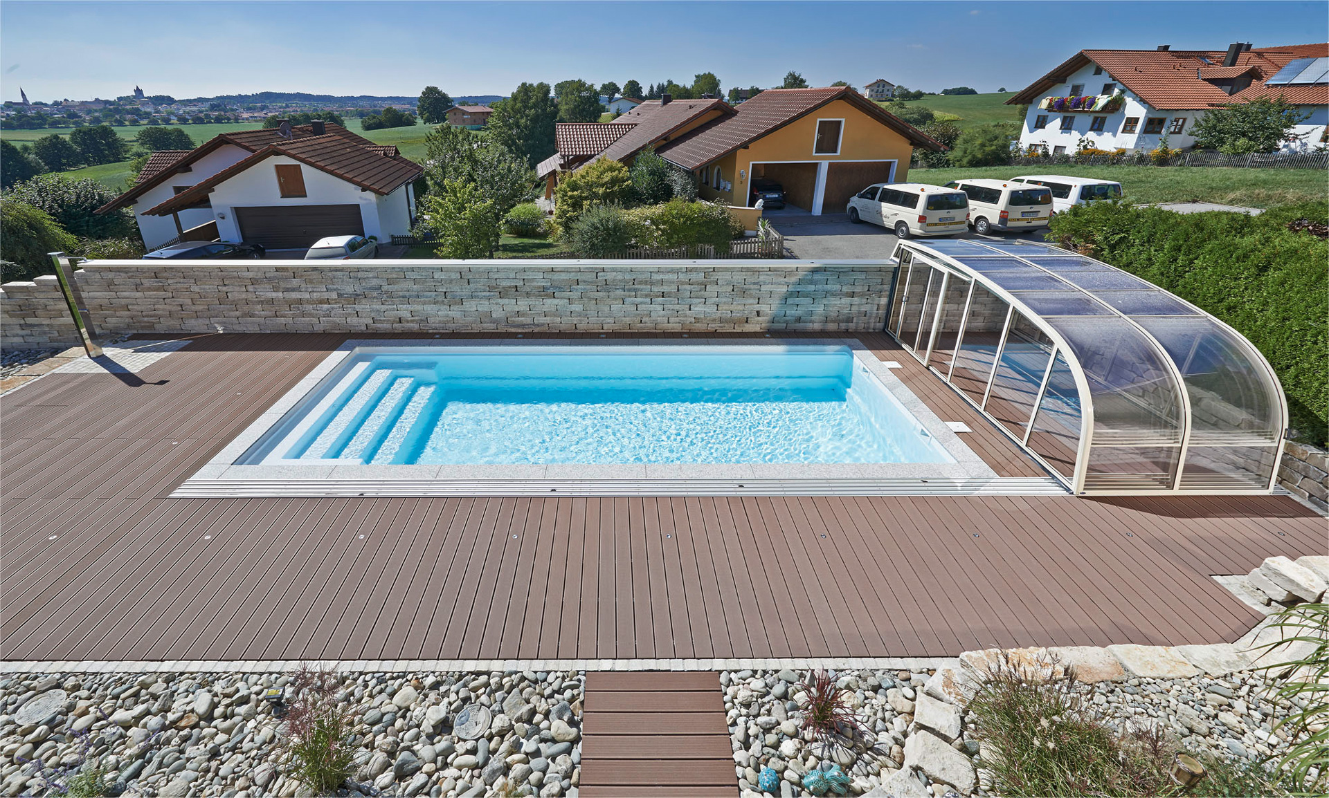 Private Schwimmbecken können direkt in die Terrasse integriert werden. Hier bietet das Modell CREATIVE PLUS den Vorteil, dass eine Laufschiene direkt an oder auf eine Wand angebracht wird. Eine andere Möglichkeit ist die teleskopisch bewegbare Version.