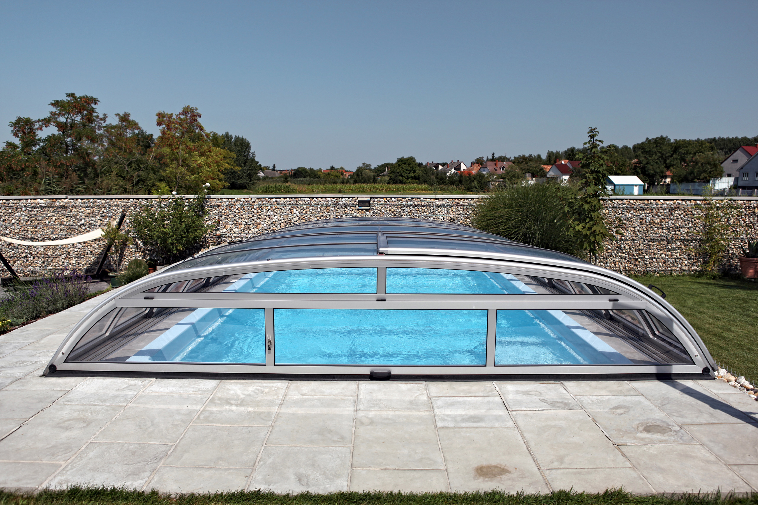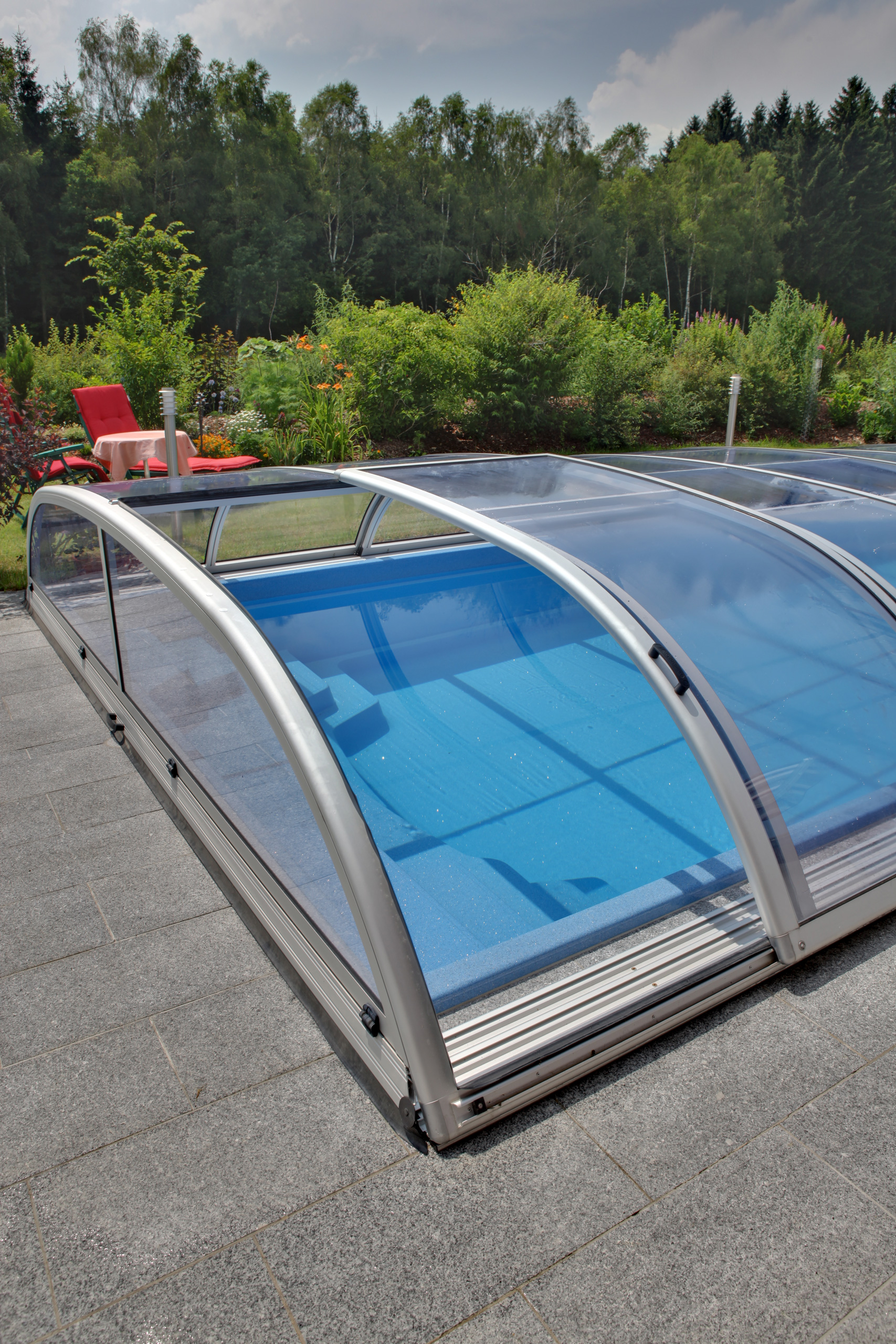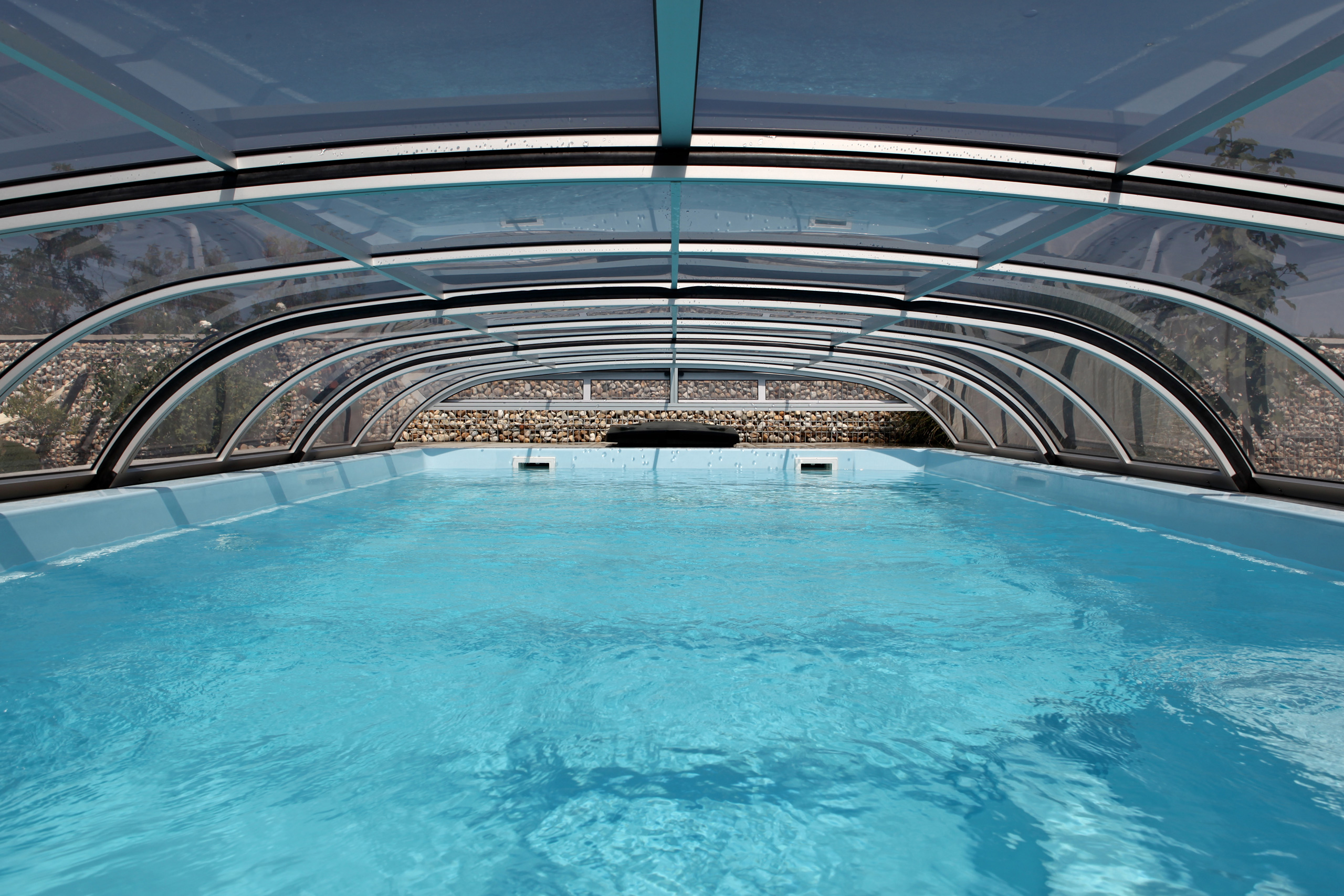 Die Poolüberdachung hilft effektiv das Wasser zu erwärmen und reduziert somit den Wärmeverlust und die Heizkosten.
