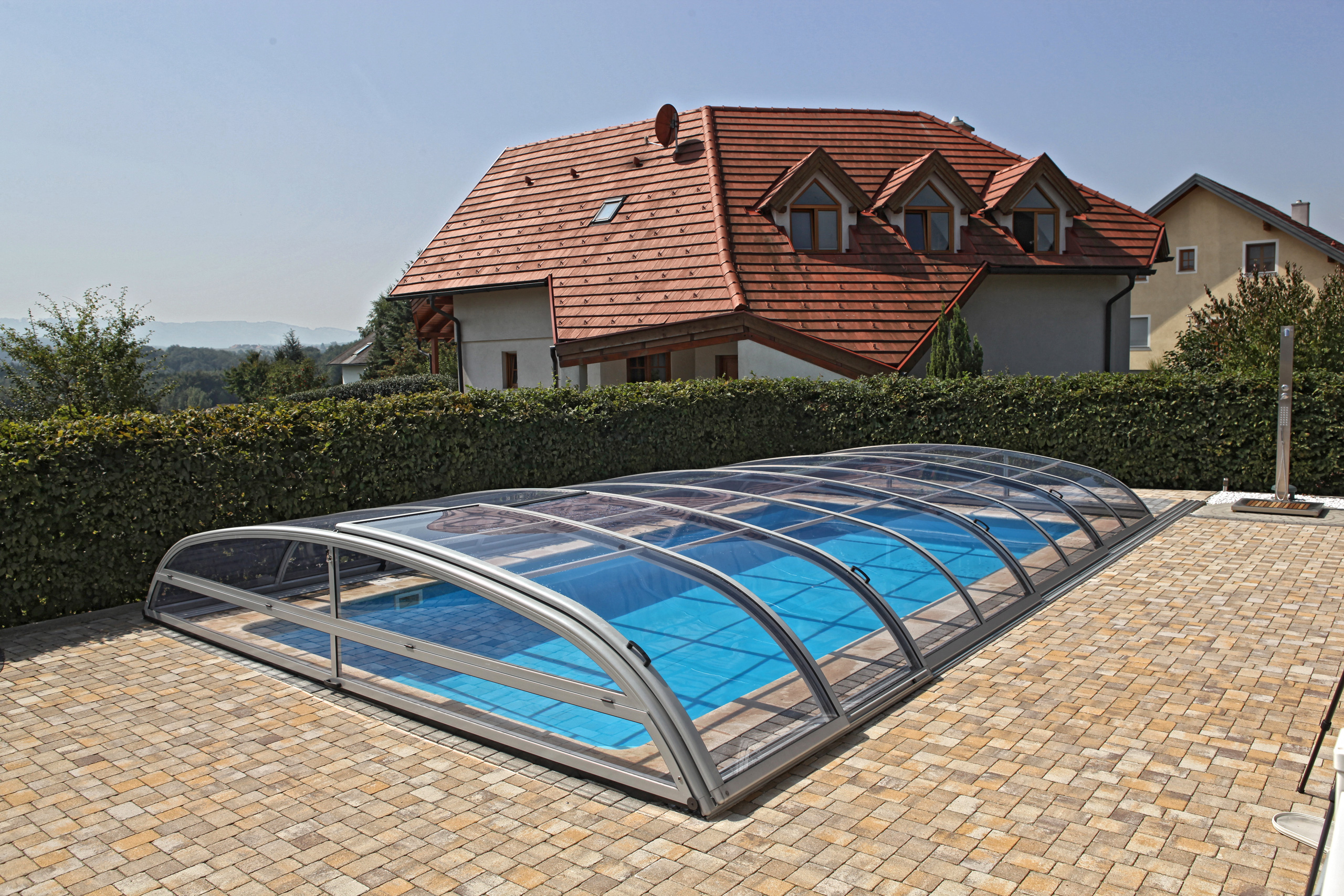 Die Poolüberdachung verlängert Ihre Badesaison um mehrere Monate und ermöglicht Badevergnügen in einer wohltemperierten Umgebung auch bei schlechtem Wetter.