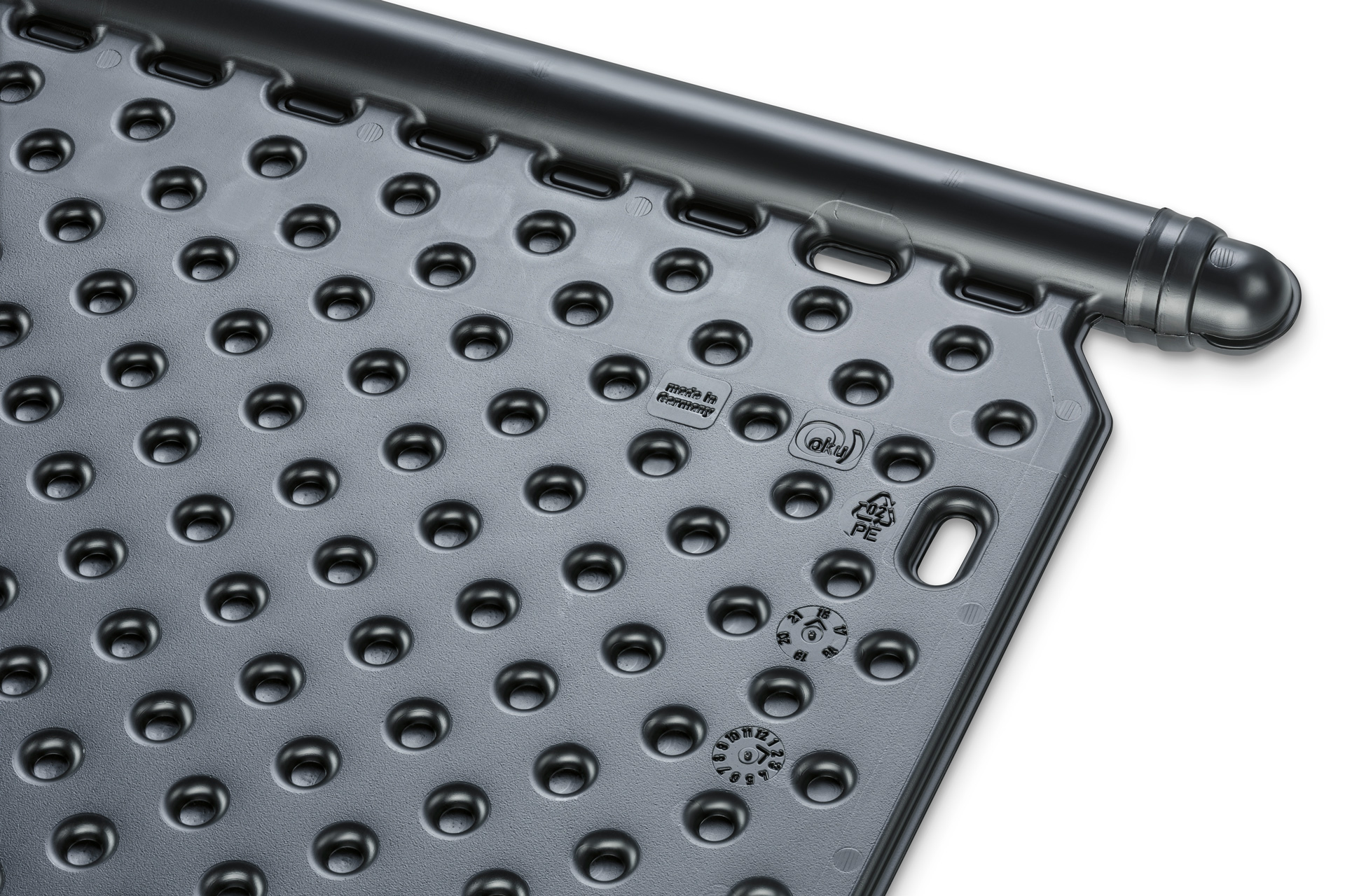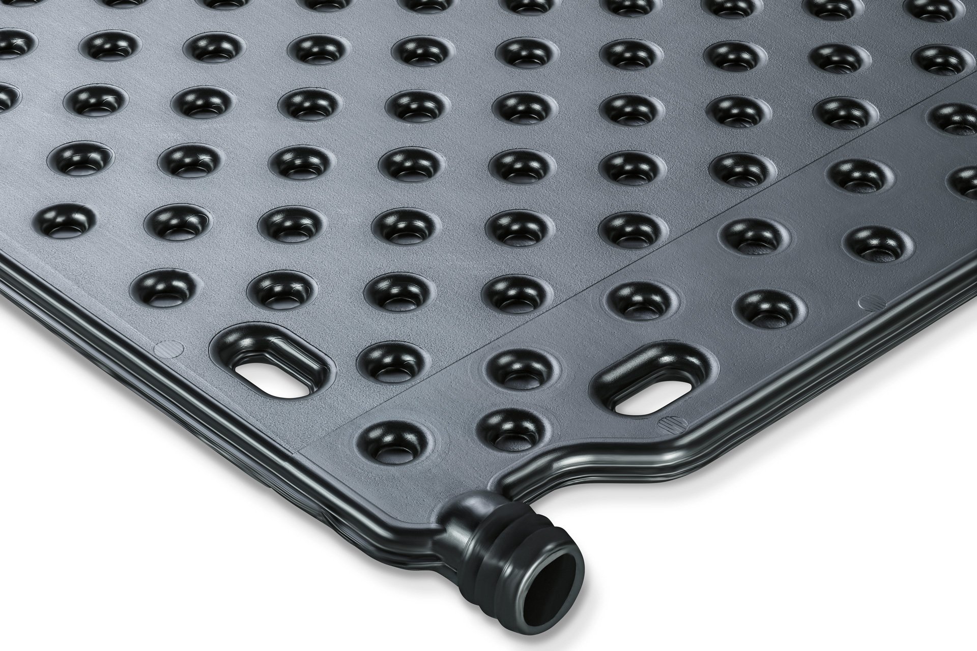 In einem Stück gegossen und homogen schwarz eingefärbt. Betrieb oft mit der vorhandenen Filterpumpe möglich.Korrosionsfrei und schwimmbadwasserfest. Das Schwimmbadwasser wird direkt durch die Absorber gepumpt.Vollflächig Durchströmt, frostsicher und begehbar.