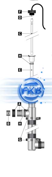 1. Das Gerät mit den dreiteiligen Kupplungen (A) im Kreis anbringen; dazu eventuell die mitgelieferten Reduzierringe (B) verwenden.2. Das Gerät mit den mitgelieferten Rohrschellen (G) an einer festen Stelle montieren und die dreiteilige Kupplung (A) festdrehen. Für ausreichend Platz zum Entfernen der Lampe (C) / der Quarzglasröhre (E) bei Auswechseln bzw. Wartung sorgen. 3. Die Lampe (C) in der weißen Lampenfassung (D) befestigen, vorsichtig in die Quarzglasröhre (E) schieben und der Schraubdeckel (F) handfest auf das Gerät aufschrauben. 4. Die Pumpe in Betrieb setzen und die Anlage auf Wasserfluss und Dichtheit prüfen. Dabei auf einwandfreien Sitz der Dichtringe (H1 & H2) sowohl an den Anschlüssen als auch bei der Quarzglasröhre achten. 5. Stecker des UV-C-Geräts an eine Schukosteckdose mit Erdschlussschalter anschließen. Durch die transparenten Teile des Geräts prüfen, ob die Lampe brennt. 6. Zum Ausschalten des Geräts den Stecker aus der Steckdose ziehen, bzw. auf die Zeitschaltung der Filteranlage klemmen. |