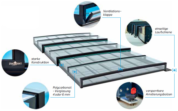 | * Maximale Grösse der Poolüberdachung ist von Anzahl der Segmente und Art der Verglasung abhängig. | ||||||||