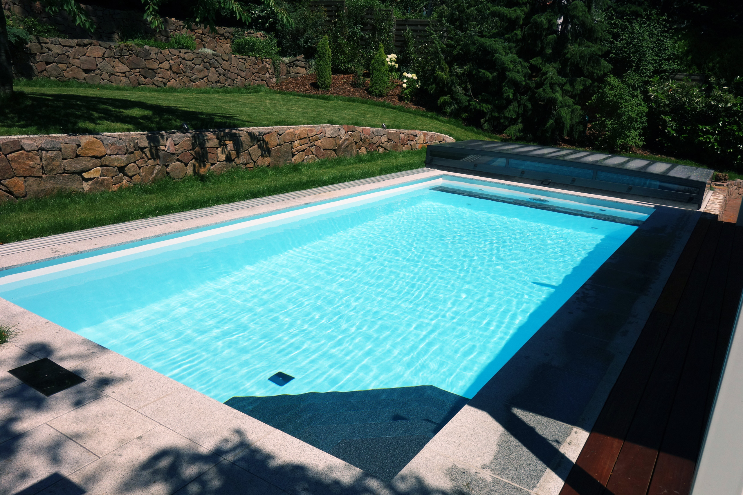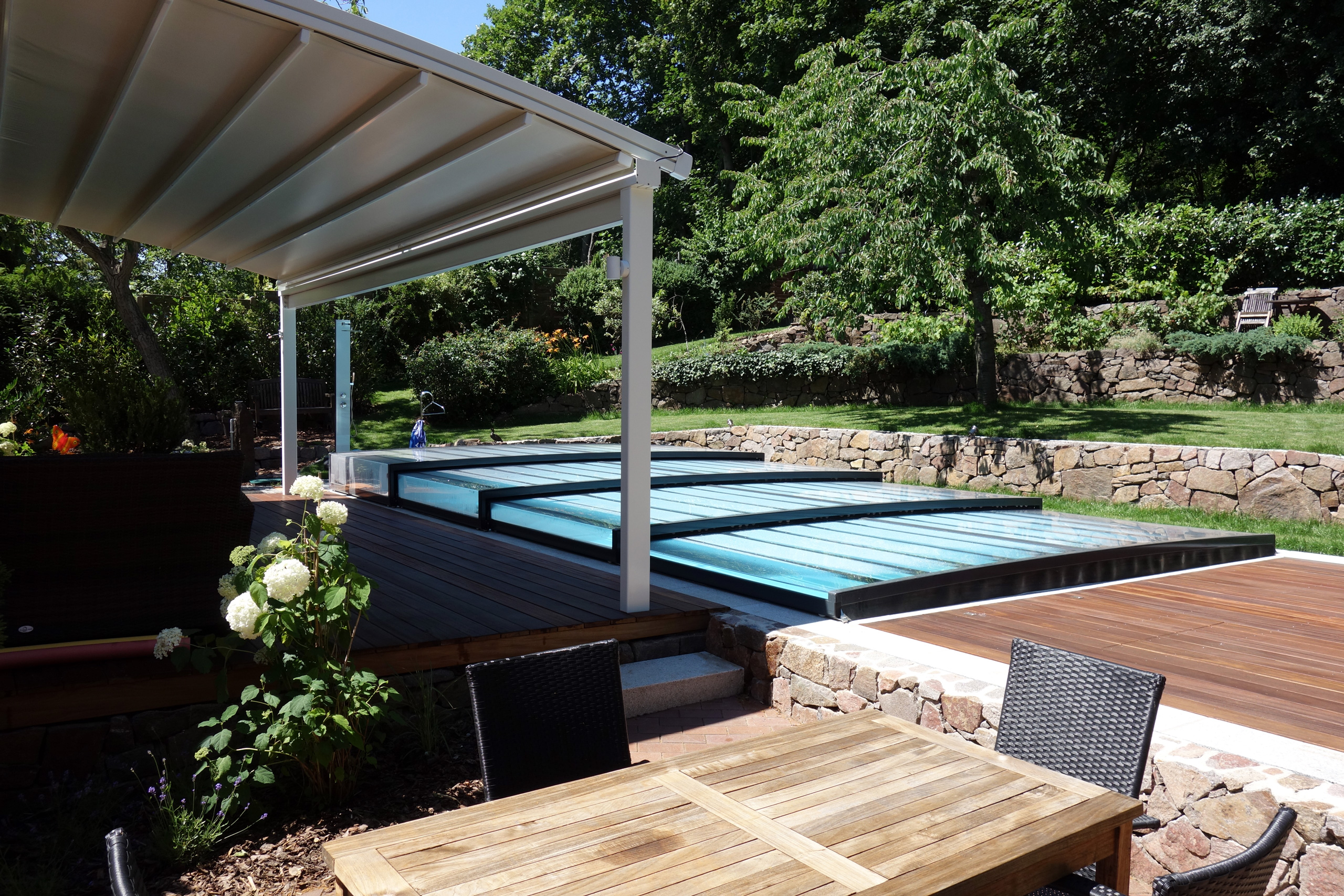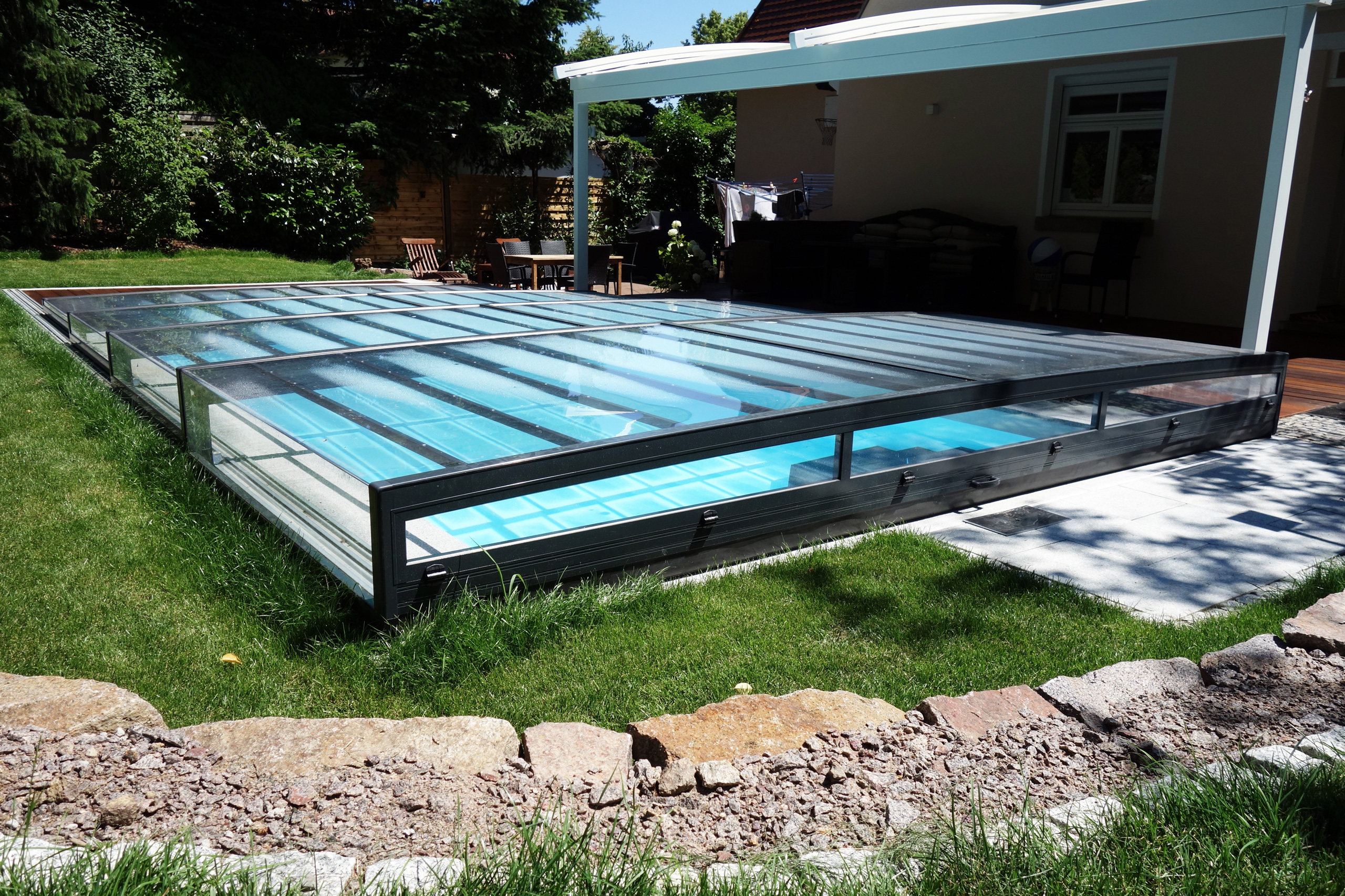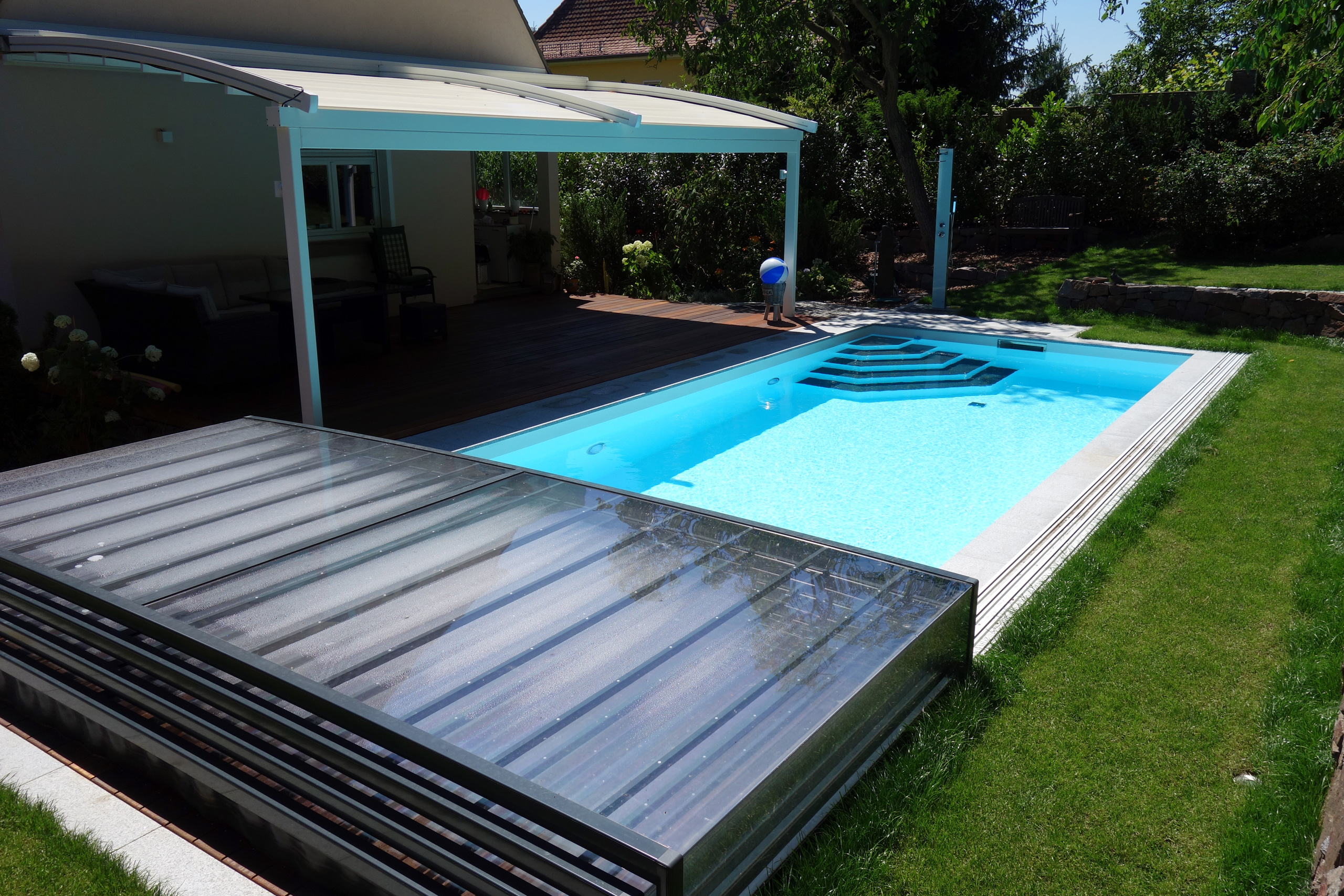 Rechteckpool 3,5x7x1,5m mit Ecktreppe und Aquacomet Horizont Überdachung
