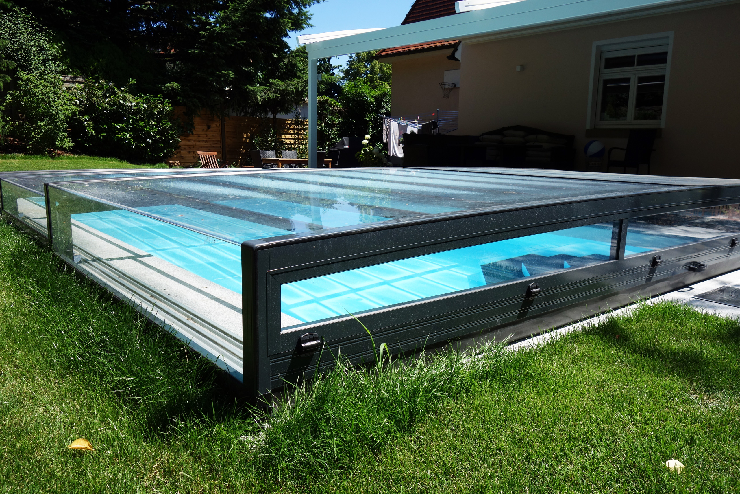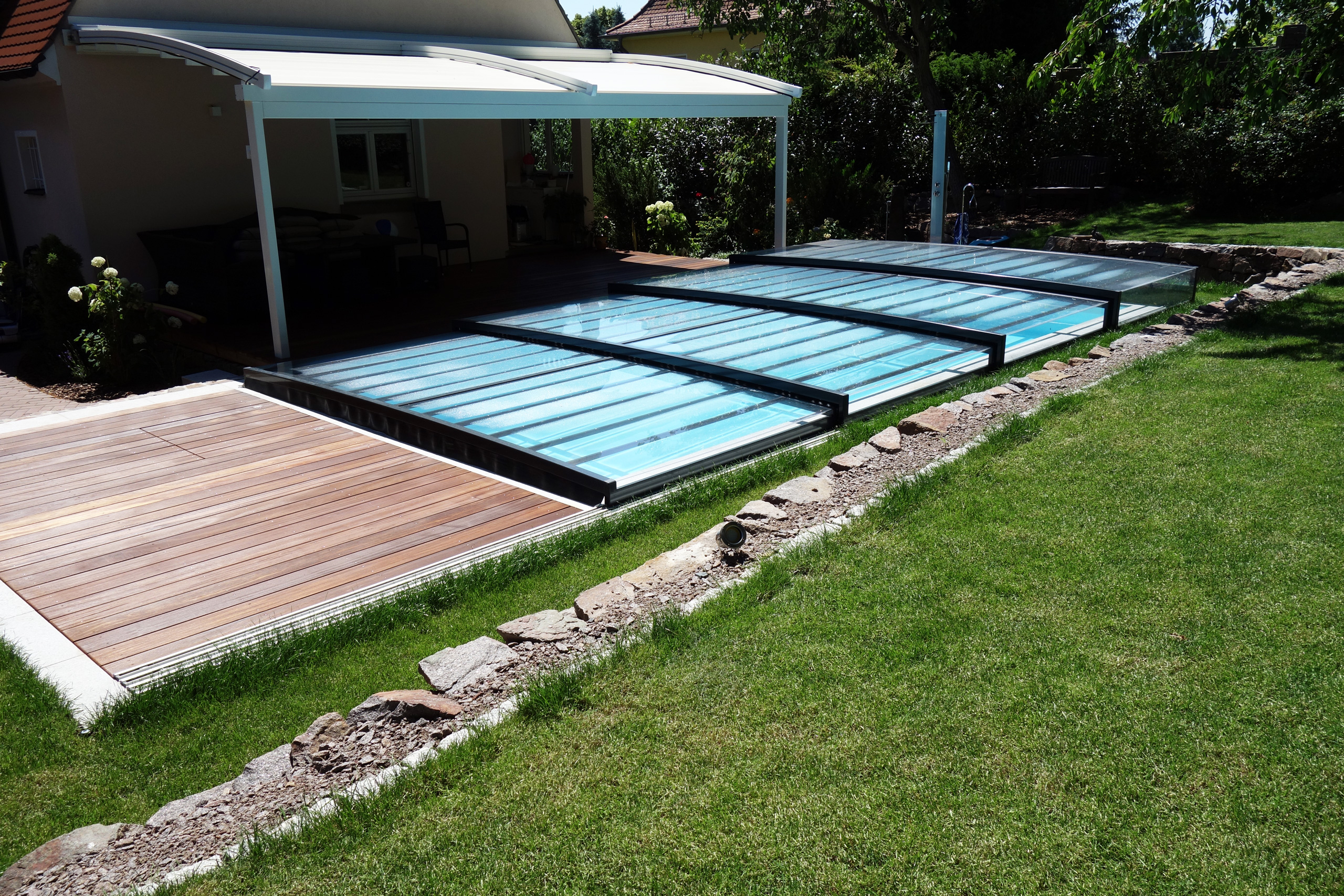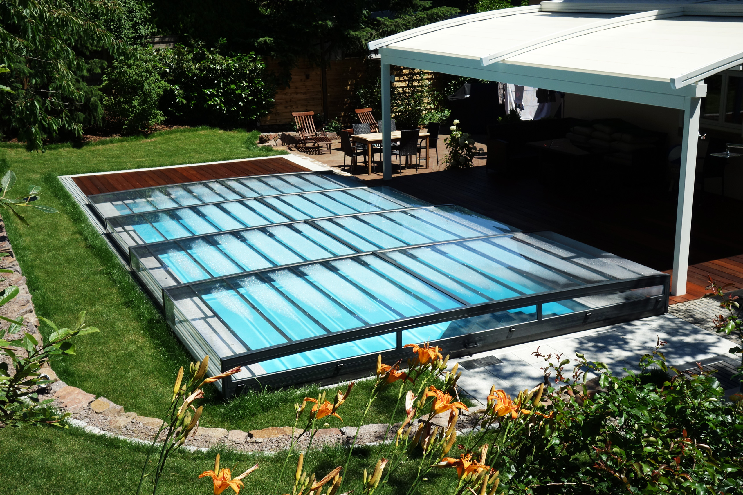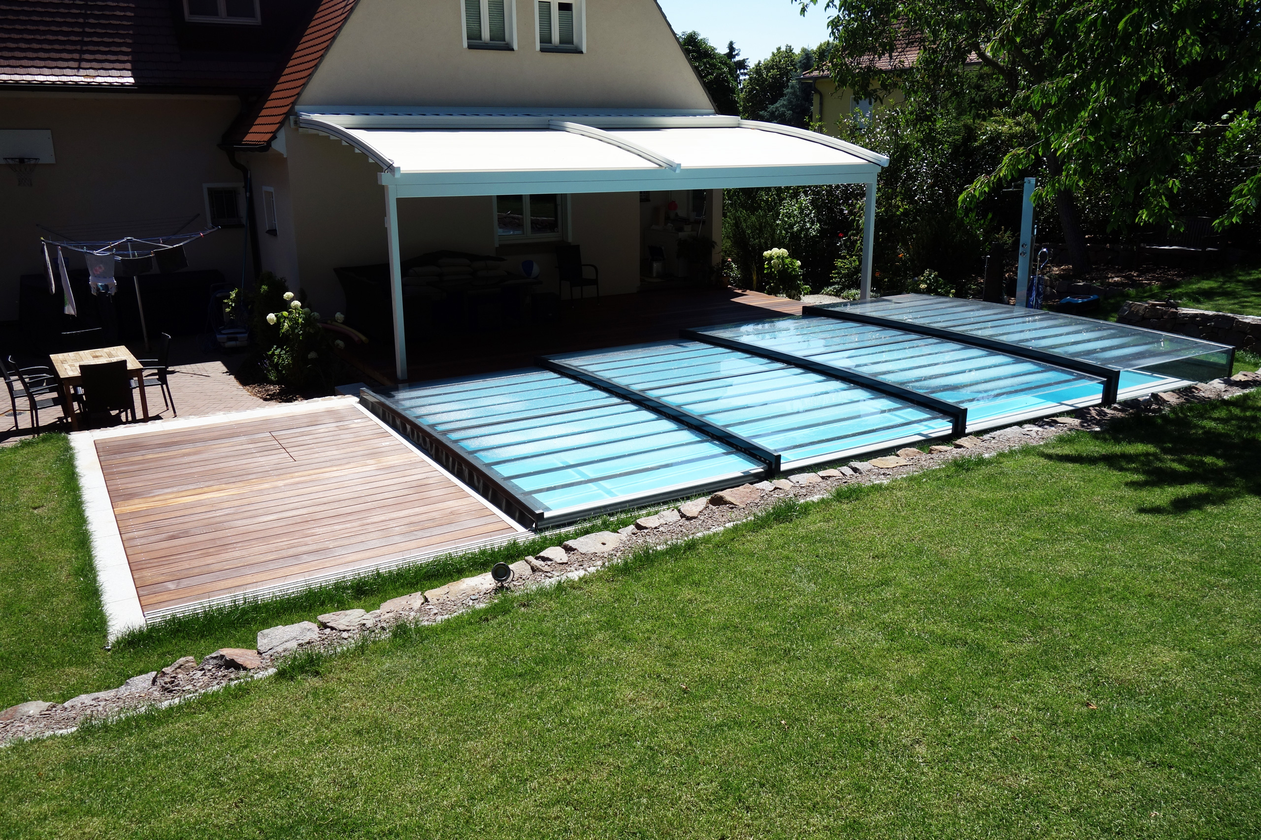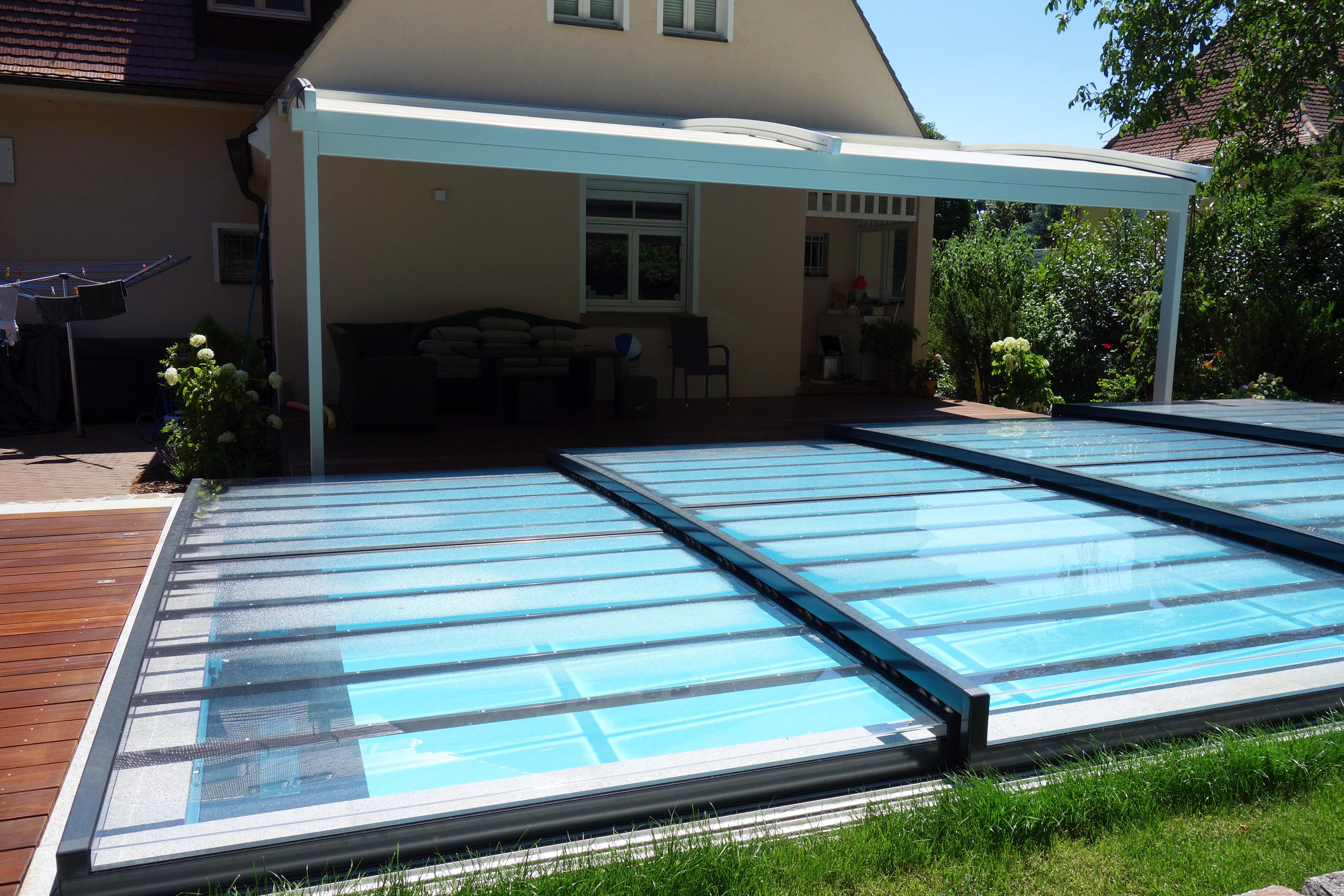 Rechteckpool 3,5x7x1,5m mit Ecktreppe und Aquacomet Horizont Überdachung