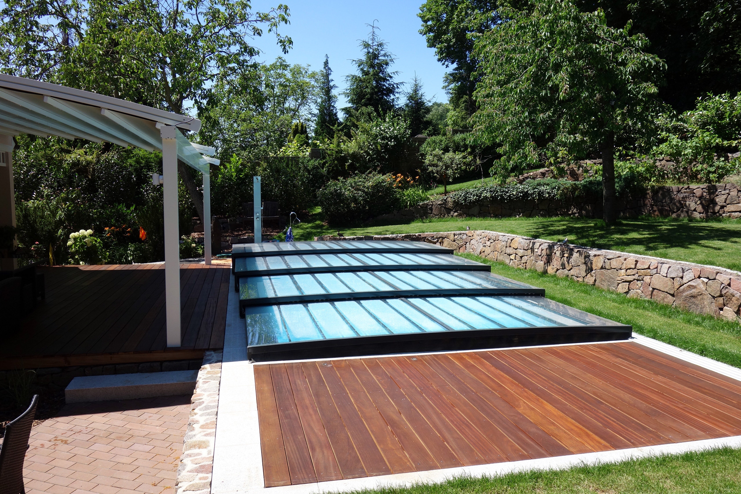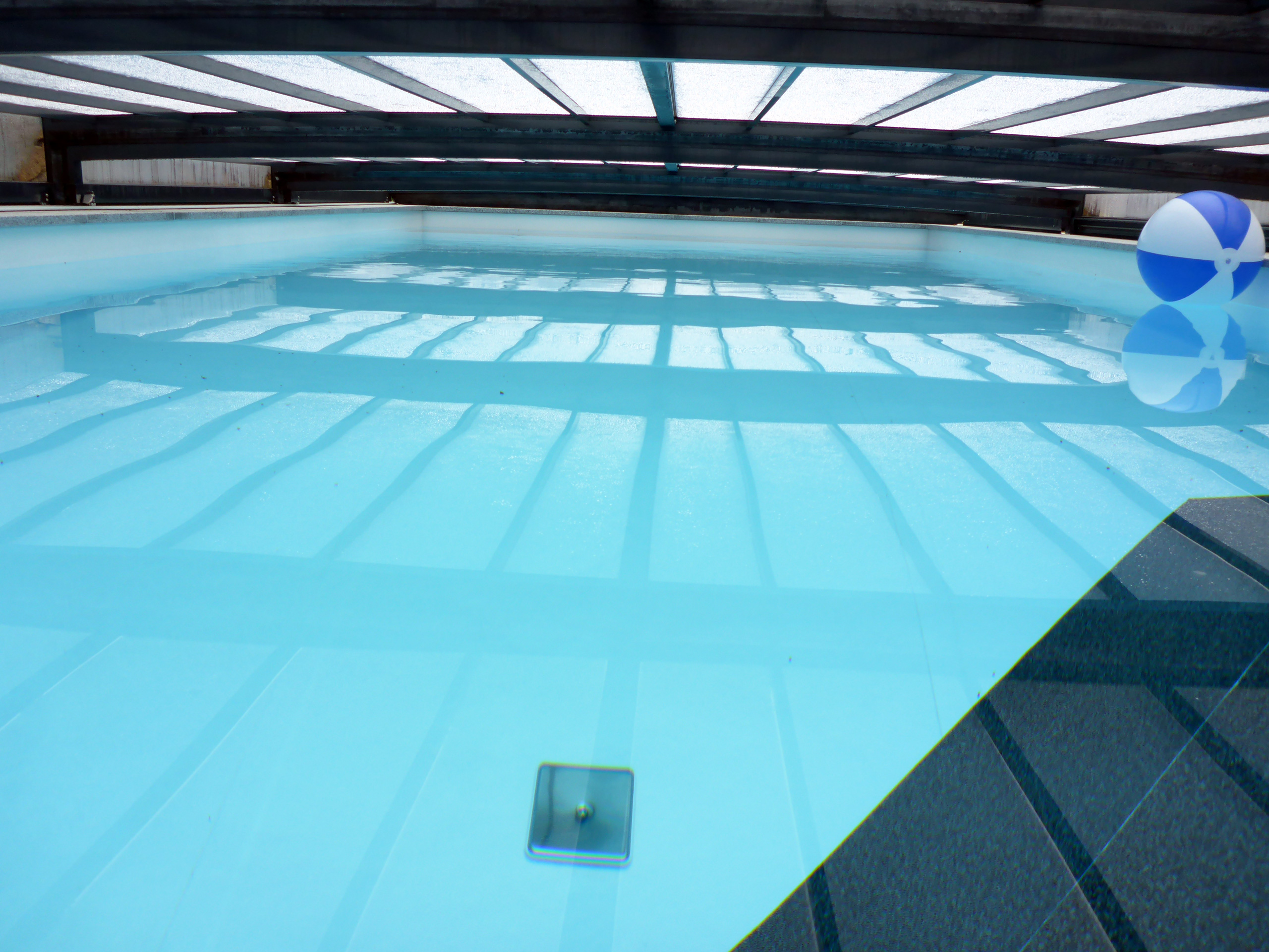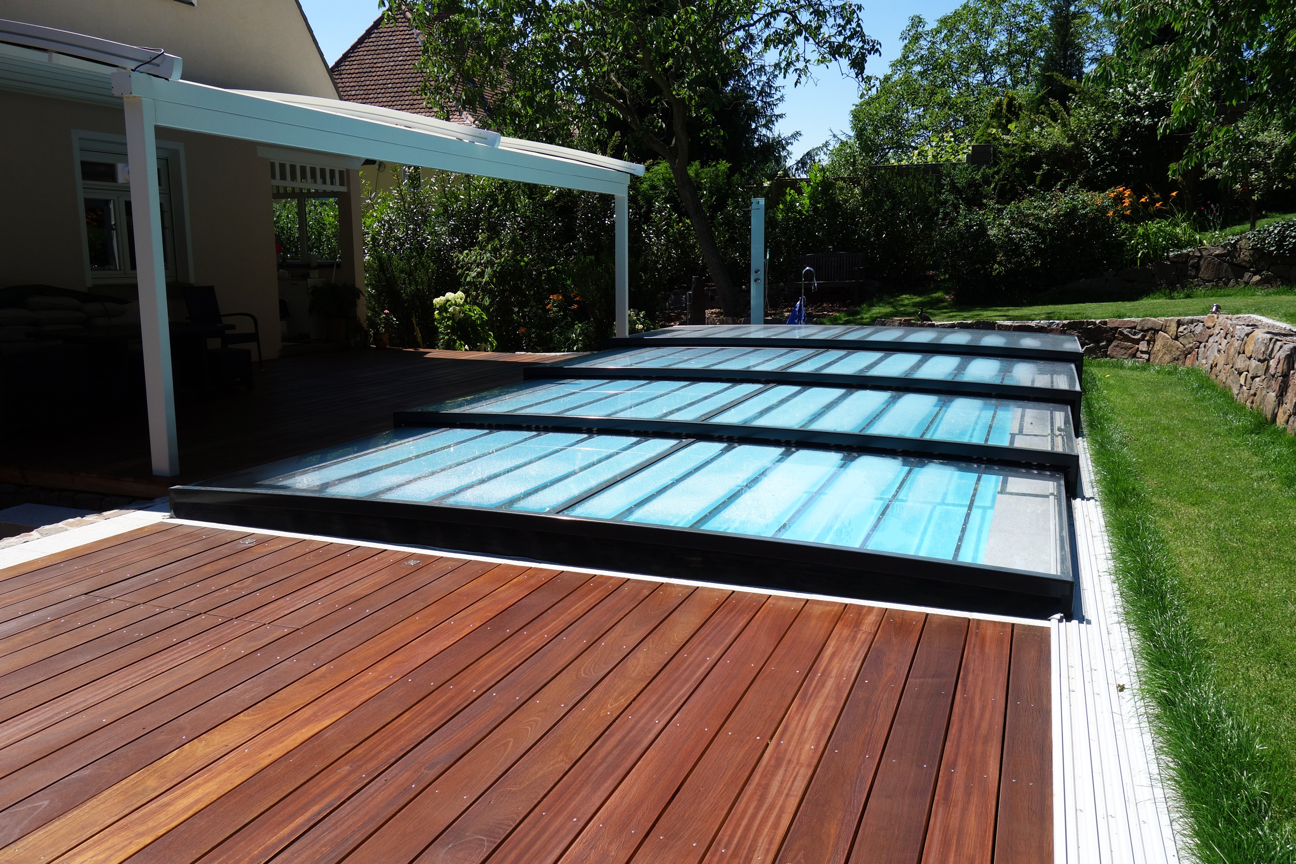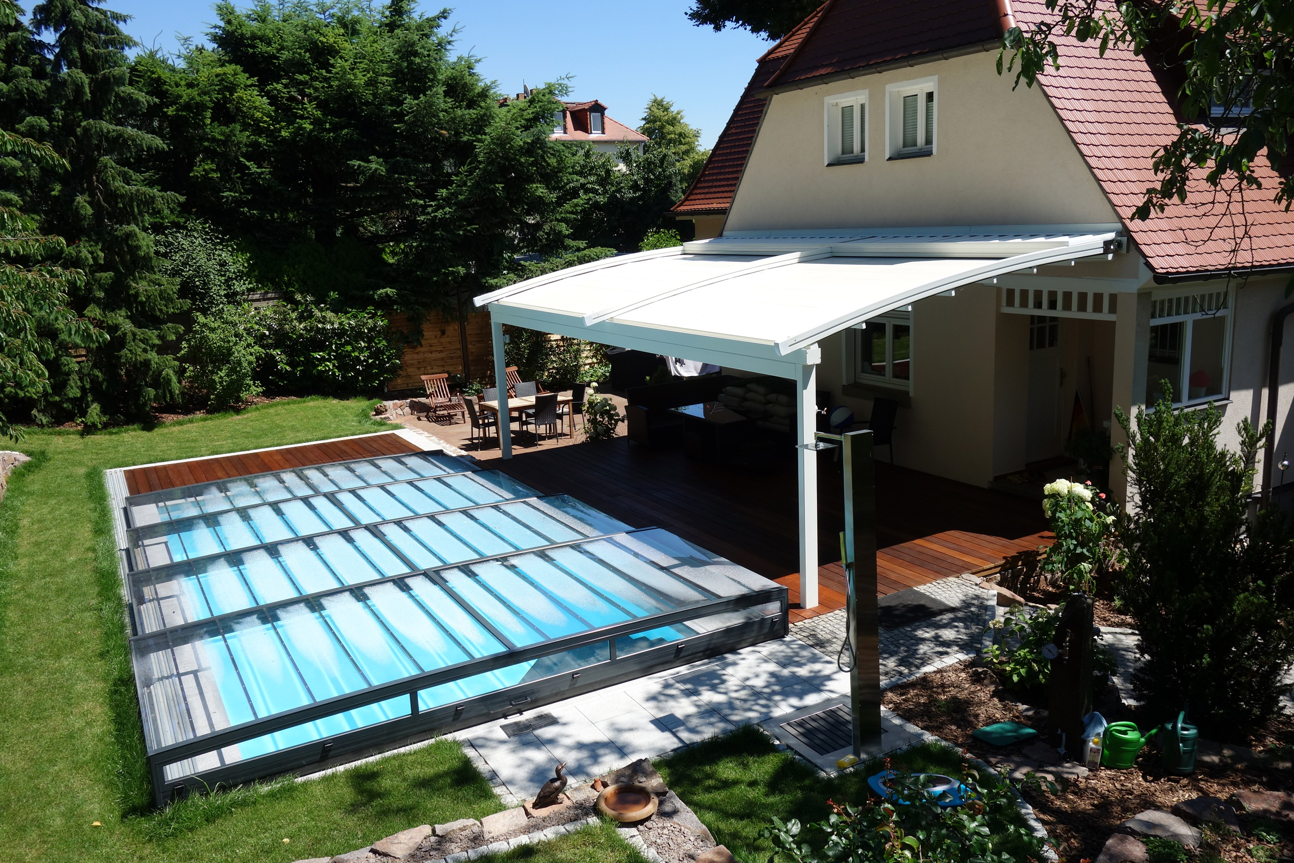 Rechteckpool 3,5x7x1,5m mit Ecktreppe und Aquacomet Horizont Überdachung