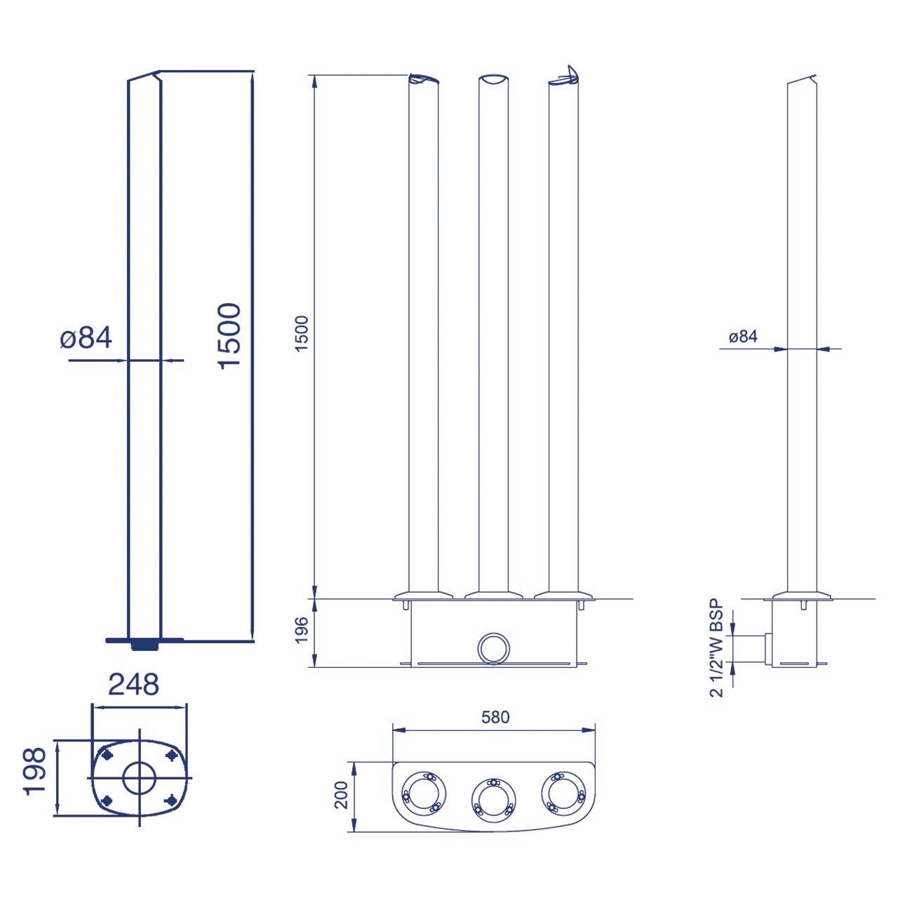 Aus V4A. Holm: Ø 84 mm, Höhe: 1,5 m. 1 bzw. 3 Rohre.