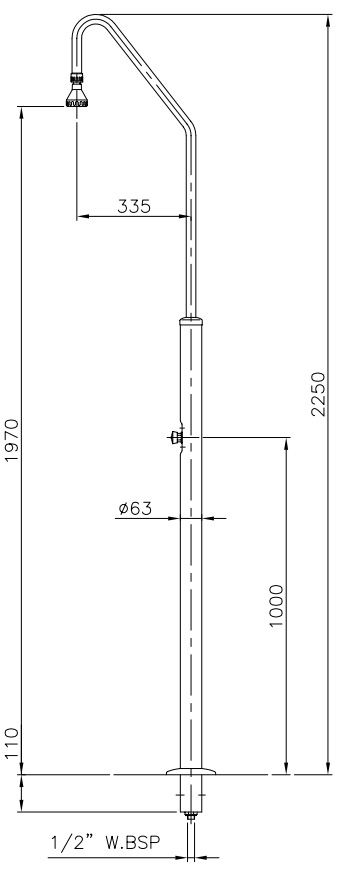 Kaltwasser- Schwimmbad-Dusche aus poliertem Edelstahlrohr (V2A), Durchmesser 63 mm, mit einer Höhe von 2,25 m.