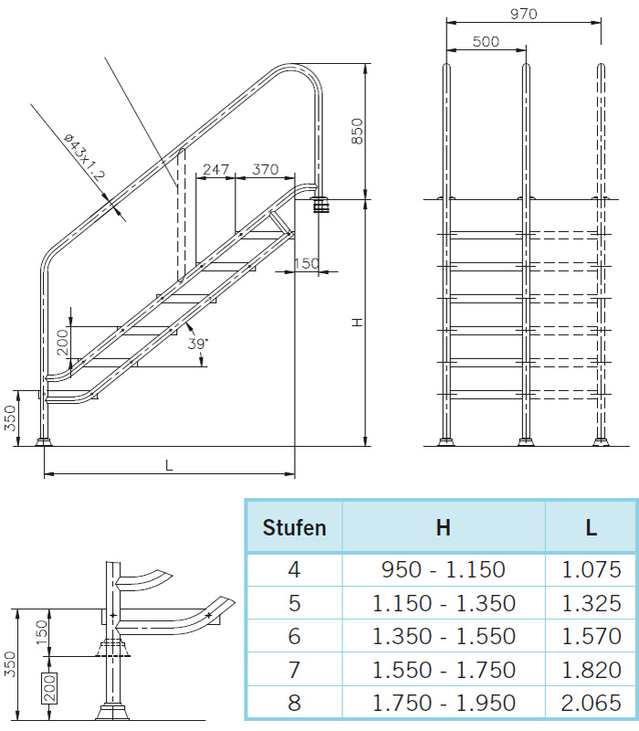 Diese Treppe sind besonders für Rehabilitierungsbecken bzw. zur Wassertherapie, sowie für Badegäste mit körperlichen Beeinträchtigungen, die keinen Lift benötigen, geeignet.