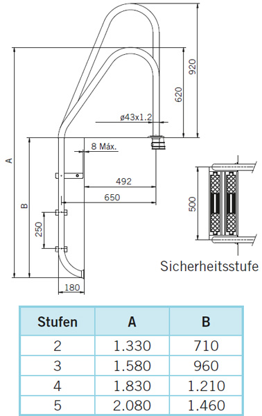 Schwimmbadleiter mit unterschiedlich hohen Leiterholmen aus poliertem Edelstahl mit einem Holmdurchmesser von 43 mm. Die Stufen sind mit besonders rutschfester Kunststoffauflage (Typ Deluxe) ausgestattet.
