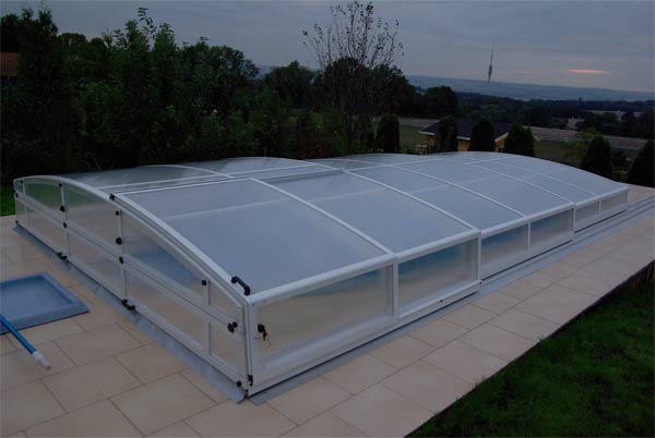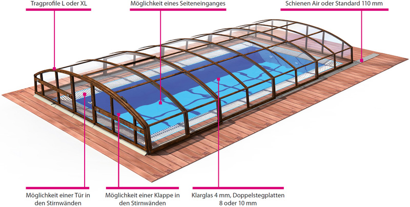 Flache oder hohe Schwimmbeckenüberdachung Casablanca, mit rechteckigem Schnitt ermöglichen eine moderne Form in jeder Höhe.