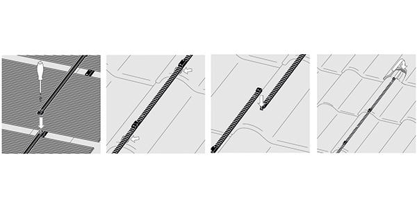 | Der Vorteil gegenüber einer geklebten Verbindung liegt auf der Hand: Leicht wieder lösbar, aber trotzdem sehr sicher. Die Solarbahnen werden nicht direkt auf das Dach geklebt, sondern lösbar von einer zweigeteilten Montageschiene sicher gehalten. Das Unterteil der Schiene wird in der Regel auf das Dach geklebt, kann aber auch aufgeschraubt werden. Das spätere Auswechseln einer Solarbahn oder eines einzelnen Sammelrohrs ist somit einfach zu handhaben. | ||