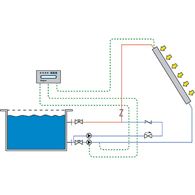Direkte solare Erwärmung von Schwimmbadwasser im Durchlaufprinzip.