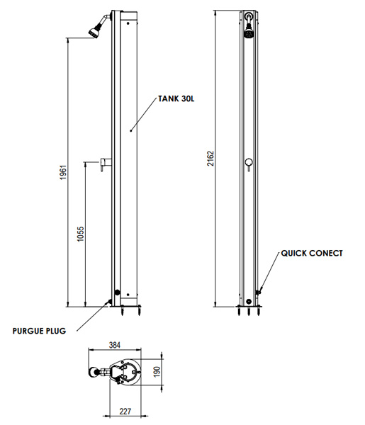 Die Aufheizung erfolgt mit Hilfe eines 30 Liter Behälters aus Aluminium, der die Vorteile der Solarenergie umsetzt und speichert. Zur Ausstattung gehört ein verstellbarer Massageduschkopf mit drei Funktionen und einer Antikalkmembran.