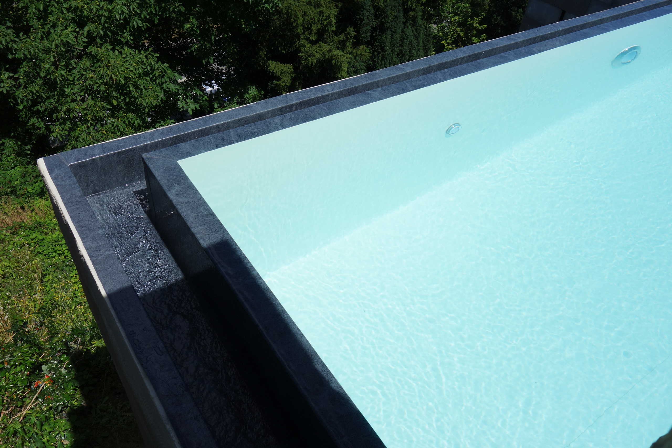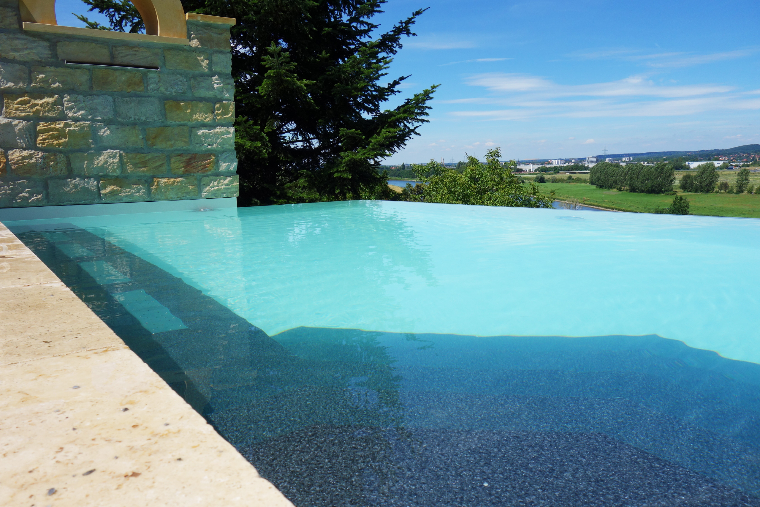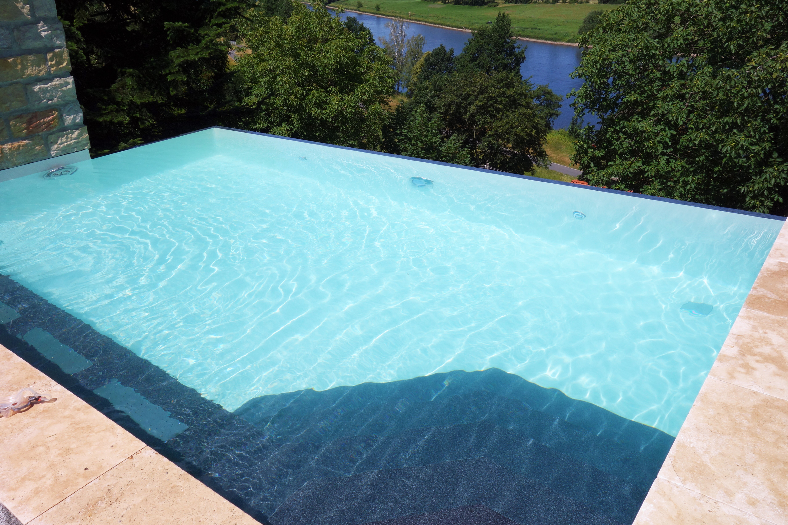 Überlaufbecken Infinity Pool 4x7x1,30m mit Ecktreppe und Sitzbank