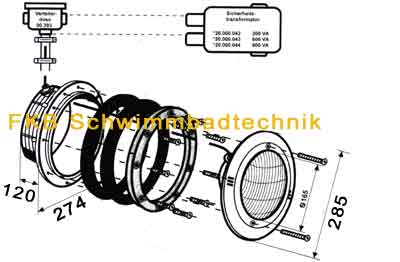 Scheinwerfereinsatz mit V4A Edelstahlblende für PAR56 Leuchtmittel. Einbaunische aus ABS-Kunststoff, mit Zuleitung und Schutzrohr. Ausführung zum Einbau in Becken mit Folien-, Fliesenauskleidung und Sichtbeton.