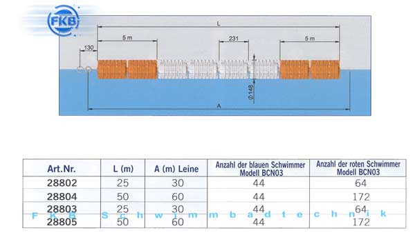 Die Schwimmleinen werden montiert mit Schwimmern und Kabeln aus rostfreiem Stahl 6 mm (Art.-Nr.: 28808) und haken (00207) ausgerüstet geliefert.